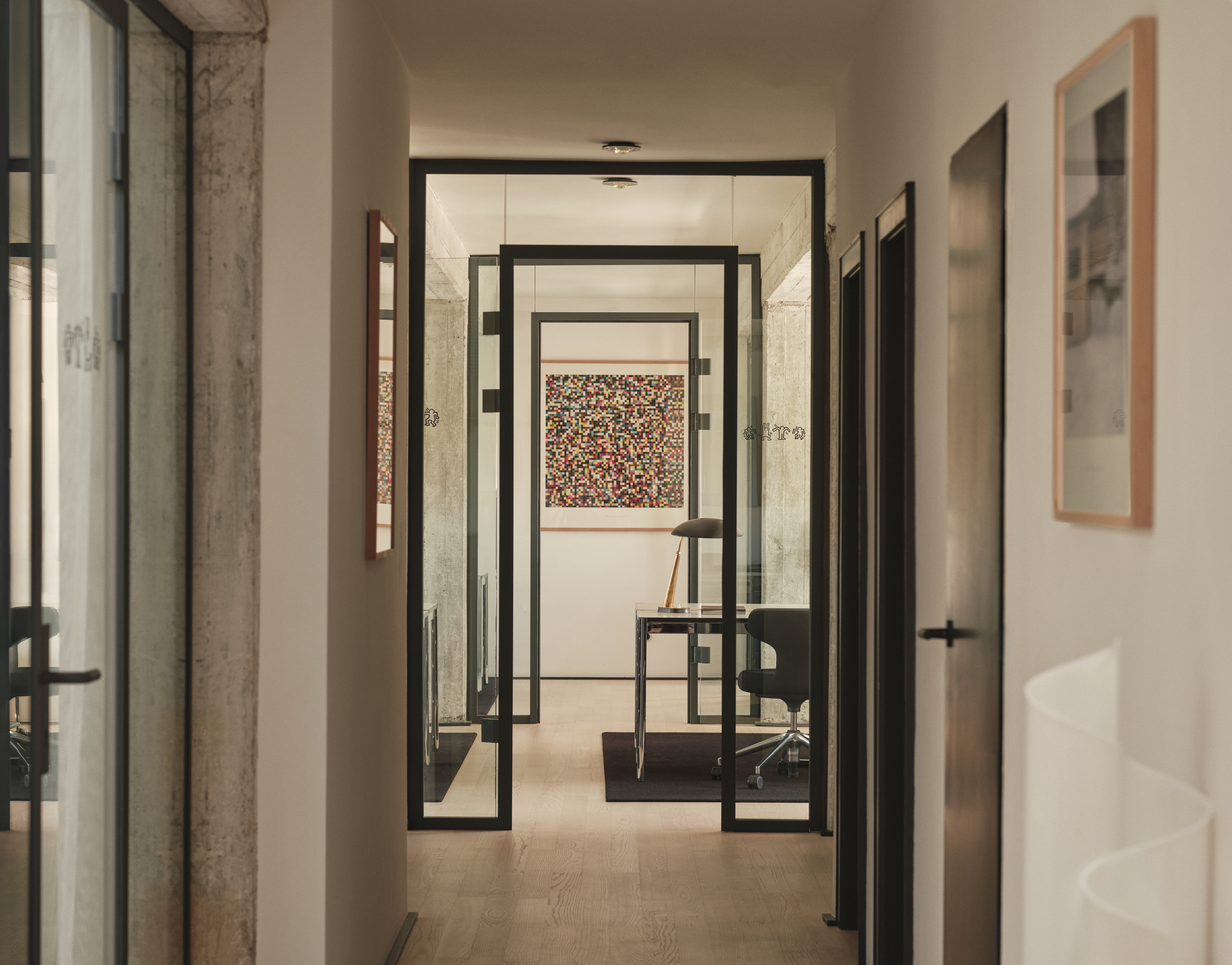 Fox Head’s red branding runs like blood through the building, from the geometric wound of an entrance, through the banquette seating on the mezzanine, terminating in a delicious red glazed conference room that brings to mind a cube of jelly.