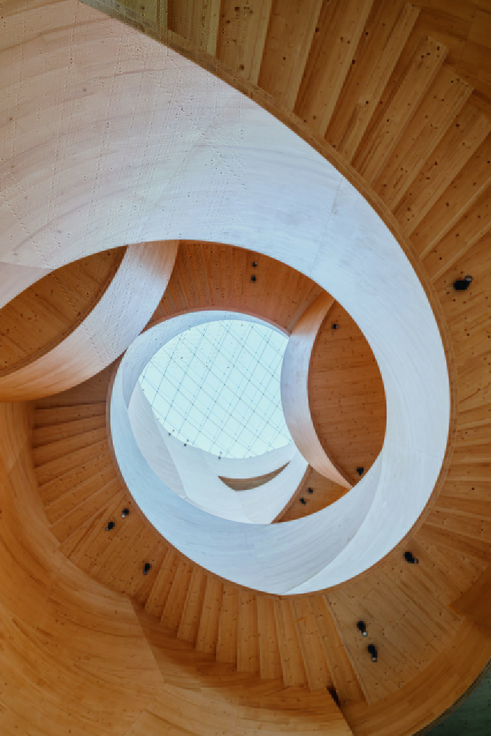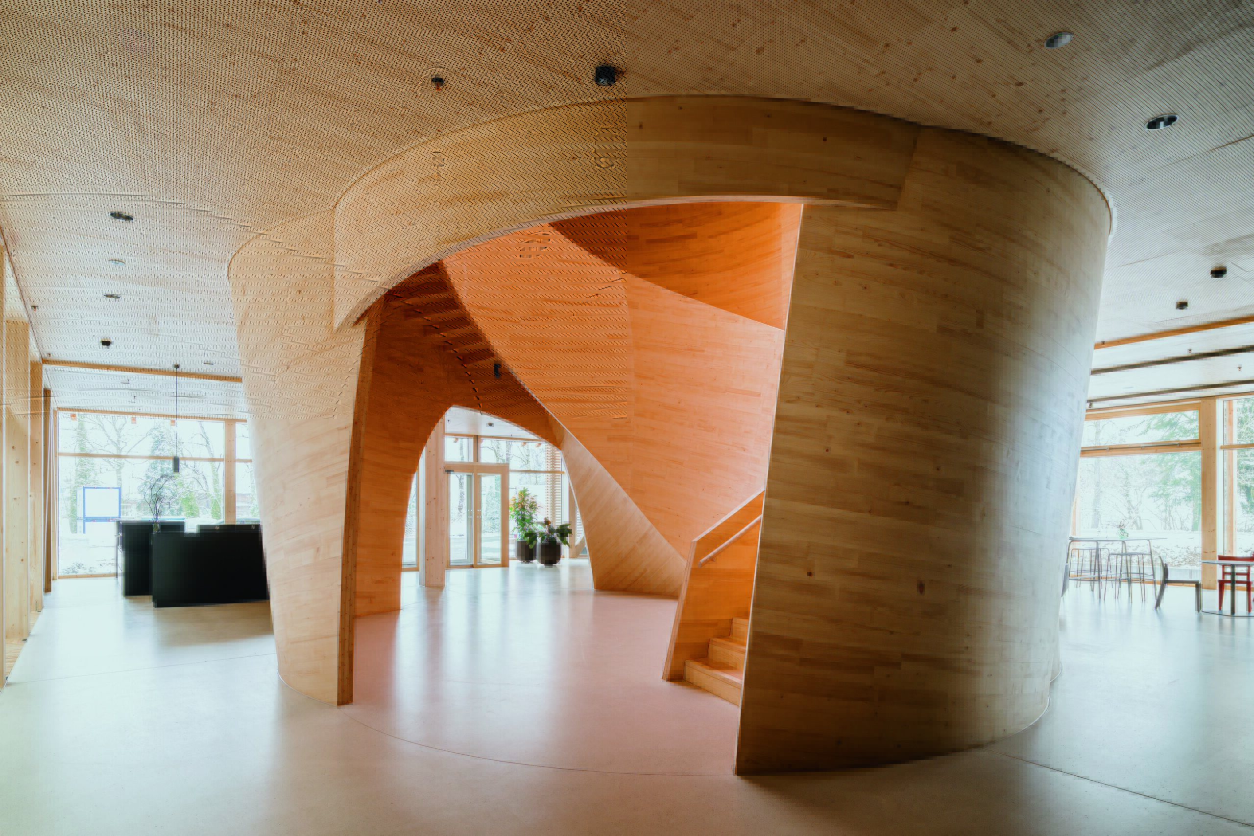 While much of the timber construction was straightforward, several elements are more experimental and push the craft into new territory. The central atrium is perhaps the most impressive. Designed in collaboration with the Institute for Computational Design and Construction (ICD) at the University of Stuttgart, it’s crafted from a new product that Blumer Lehmann was bringing to the market at the time of its design, allowing cross-laminated timber to be used to craft sweeping curved forms.