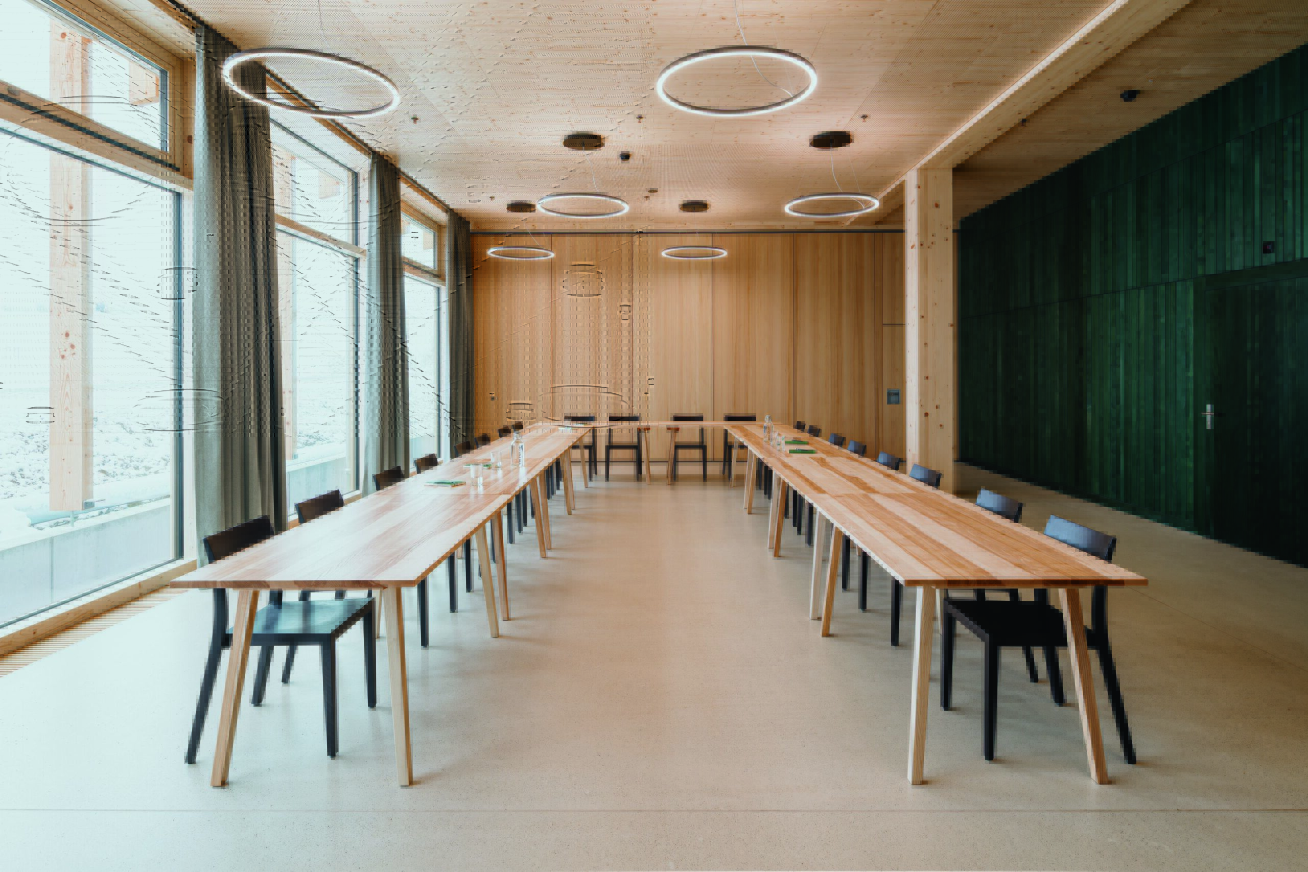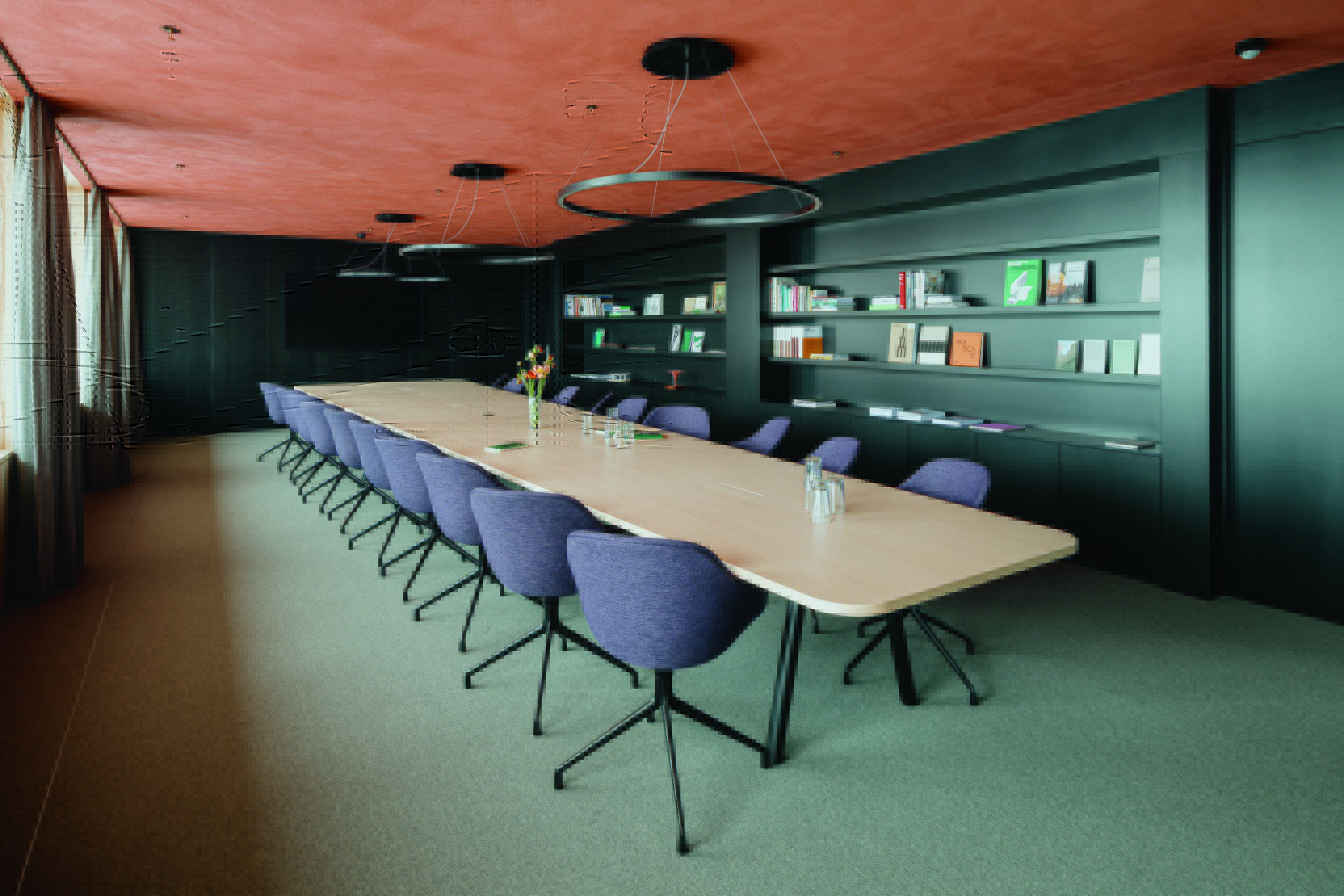 Contrast is also used to define the more functional meeting rooms located at the building’s core. The timber here is stained a dark green, setting it apart from the raw spruce and fir elsewhere. “Our concept was all about the visual contrasts,” explains Deinet. “You still see the grain of the timber beneath the stain, though, which keeps that sense of a unified material palette.”