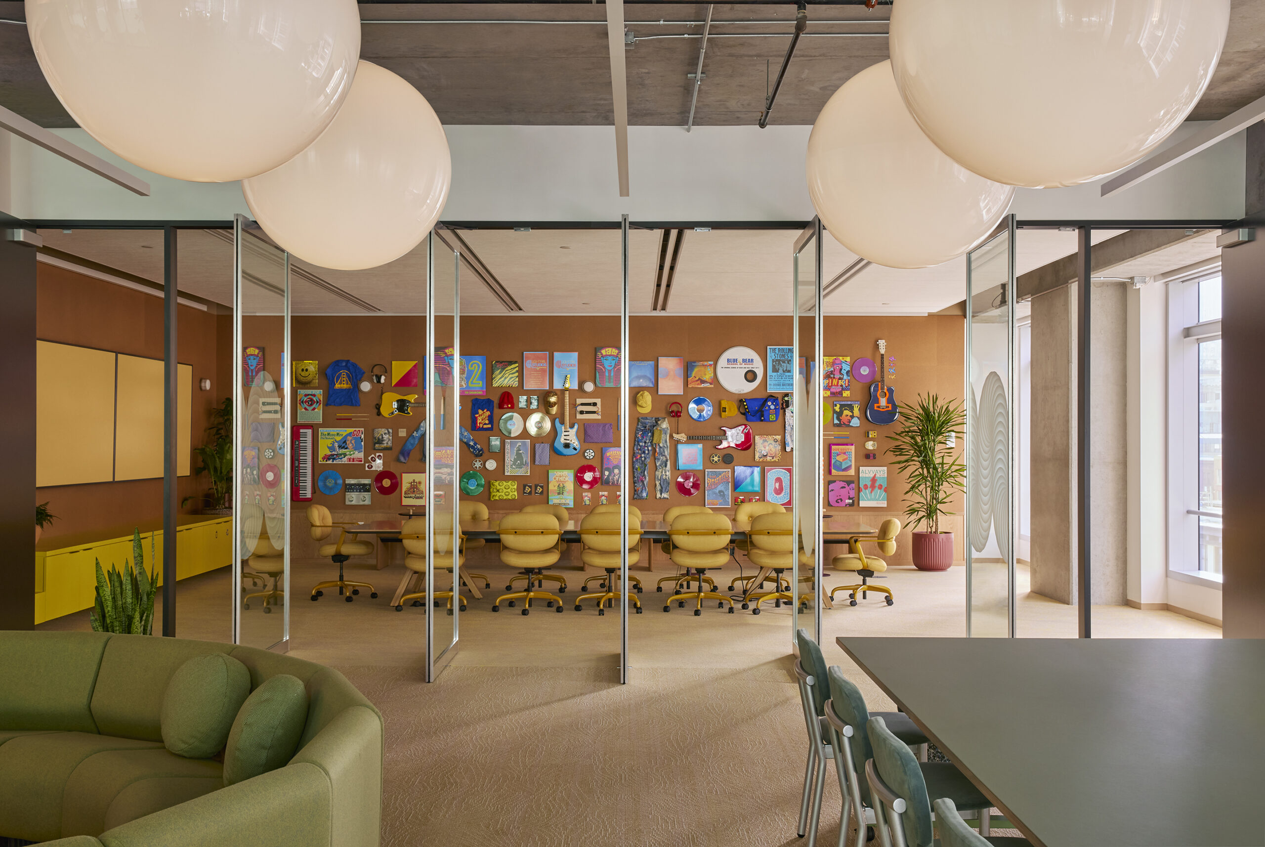A standout is a feature wall created by local artist Hannah Ember Sitzer. Located in the main conference room, the 24-foot-long installation incorporates original artefacts from 20 small businesses that are anchored in the city’s music scene, from vinyl pressers to music stores and stagewear designers.