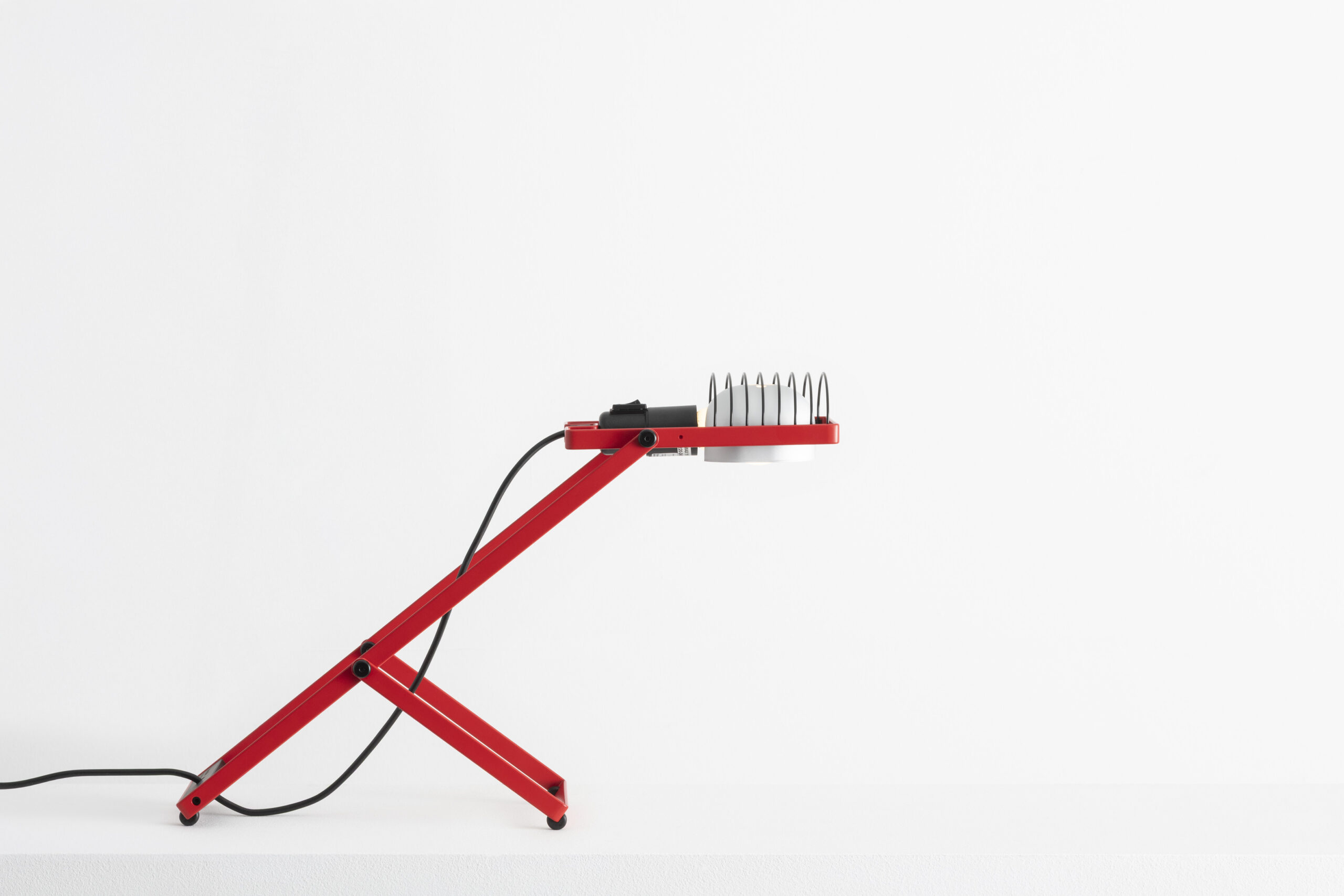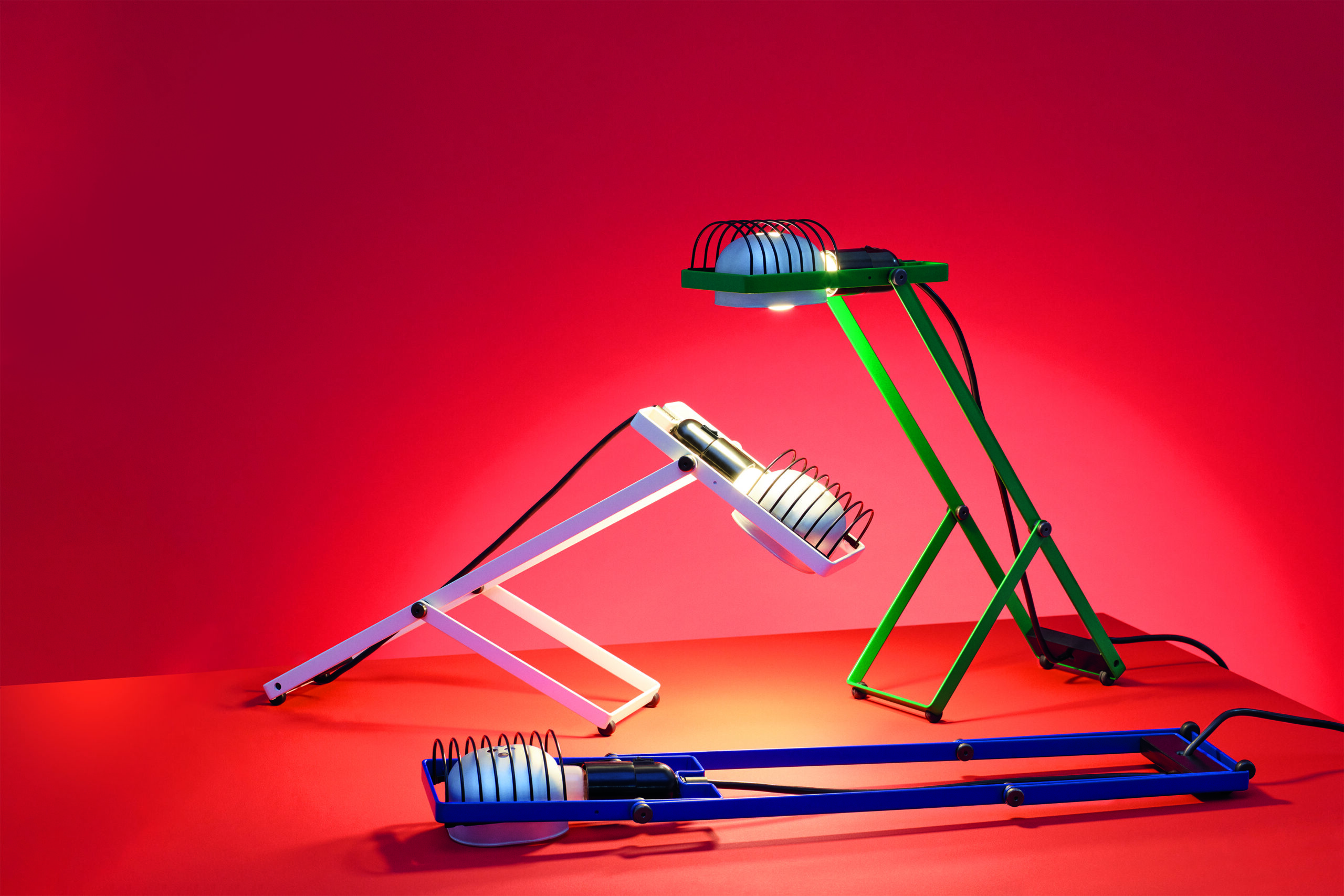 The lamp’s light source is housed within a frame fitted with an E27 socket, ensuring compatibility with evolving lighting technologies and long-term usability. A reflector and a protective grid complete the structure, reinforcing the project’s technical and functional character. Artemide has reintroduced Sintesi in a palette of colours that includes white, blue, green, as well as a new red finish.