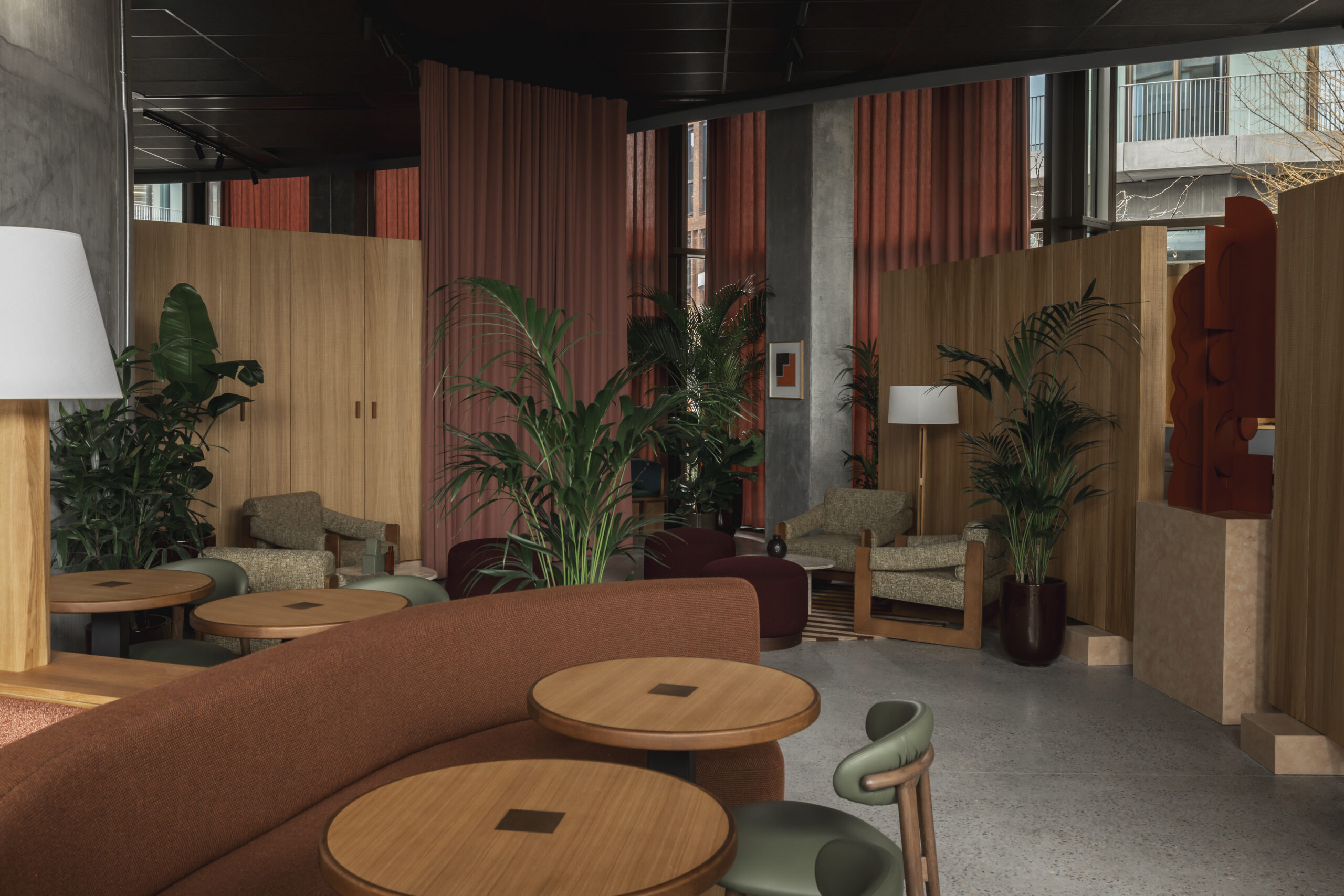 A-nrd studio has transformed the ground floor of aparthotel Locke Copenhagen into warm, layered spaces designed for gathering, meeting and dining