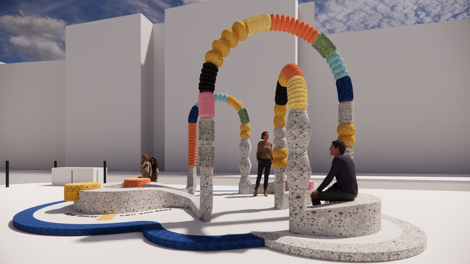Fountain of Technicolour Beads by One Bite Design on Clerkenwell Green – an immersive terrazzo work exploring Colour Vision Deficiency (CVD).