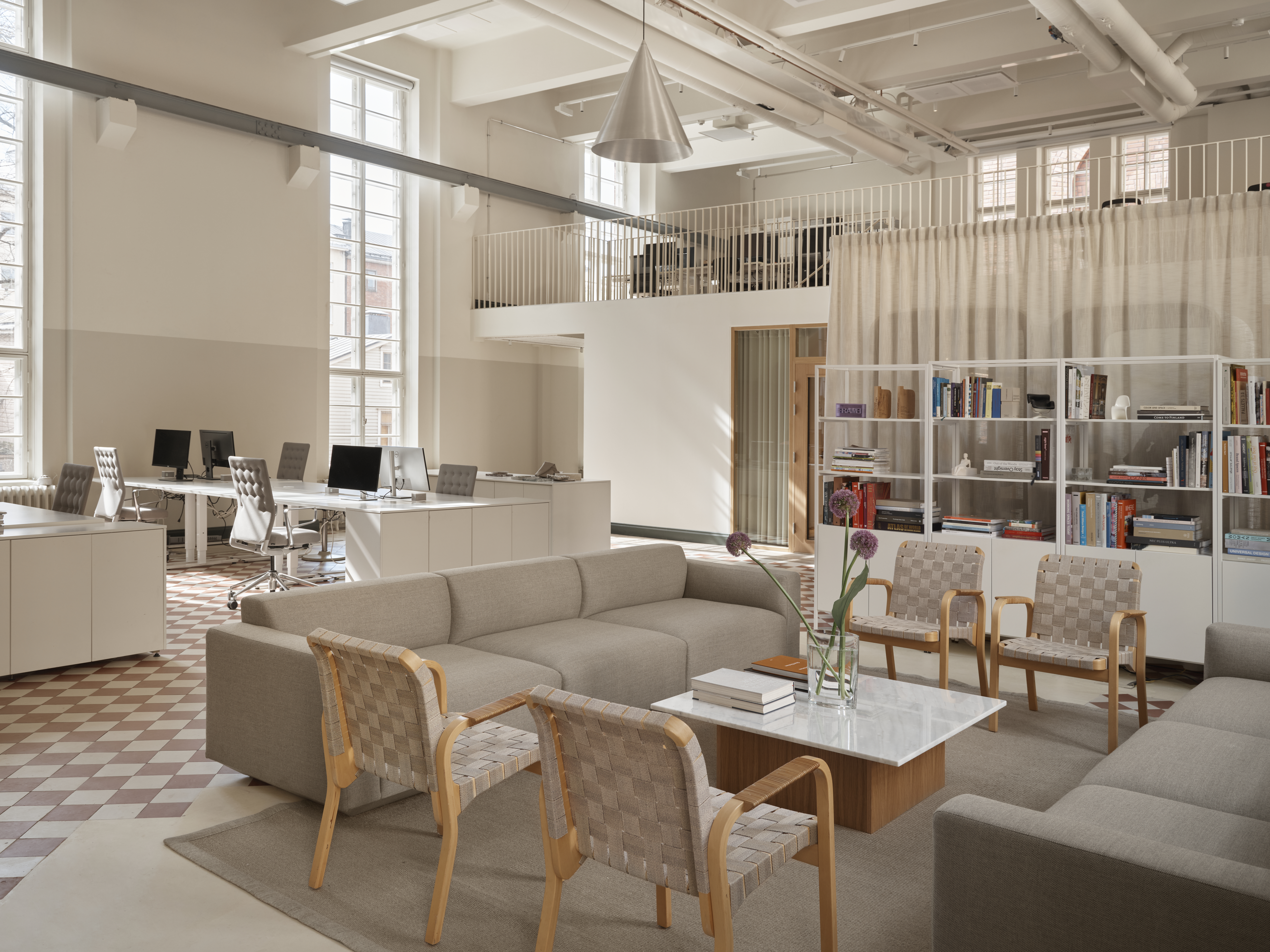 The new open-plan workspace is cleverly subdivided using diaphanous fabric curtains and shelving units, with meeting rooms tucked beneath a mezzanine level, which is filled with more desks. It’s a luminous space, with whitewashed walls and warm wooden furnishings from brands such as Finnish furniture-makers Artek. The design embraces the history of the building by carefully preserving technical relics such as cranes, dials and switchboards – and the original red-and white checkerboard tiled flooring (which was uncovered by the design team) adds a cheerful splash of colour. “All this detailing tells the story of the old school here, so we really wanted to preserve it,” says architect Otso Virtanen from ARK Helsinki, who collaborated with the Fyra team on the project.