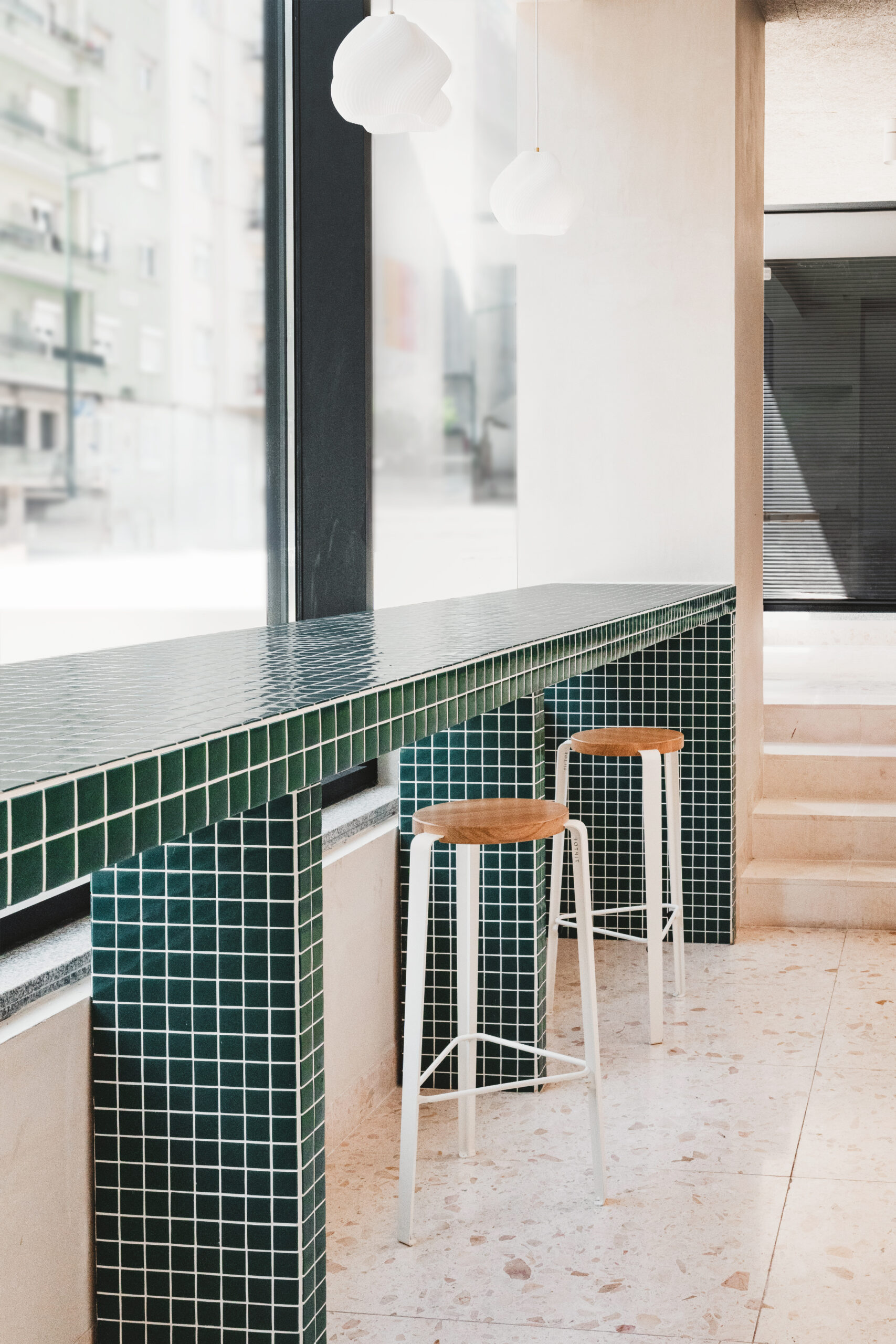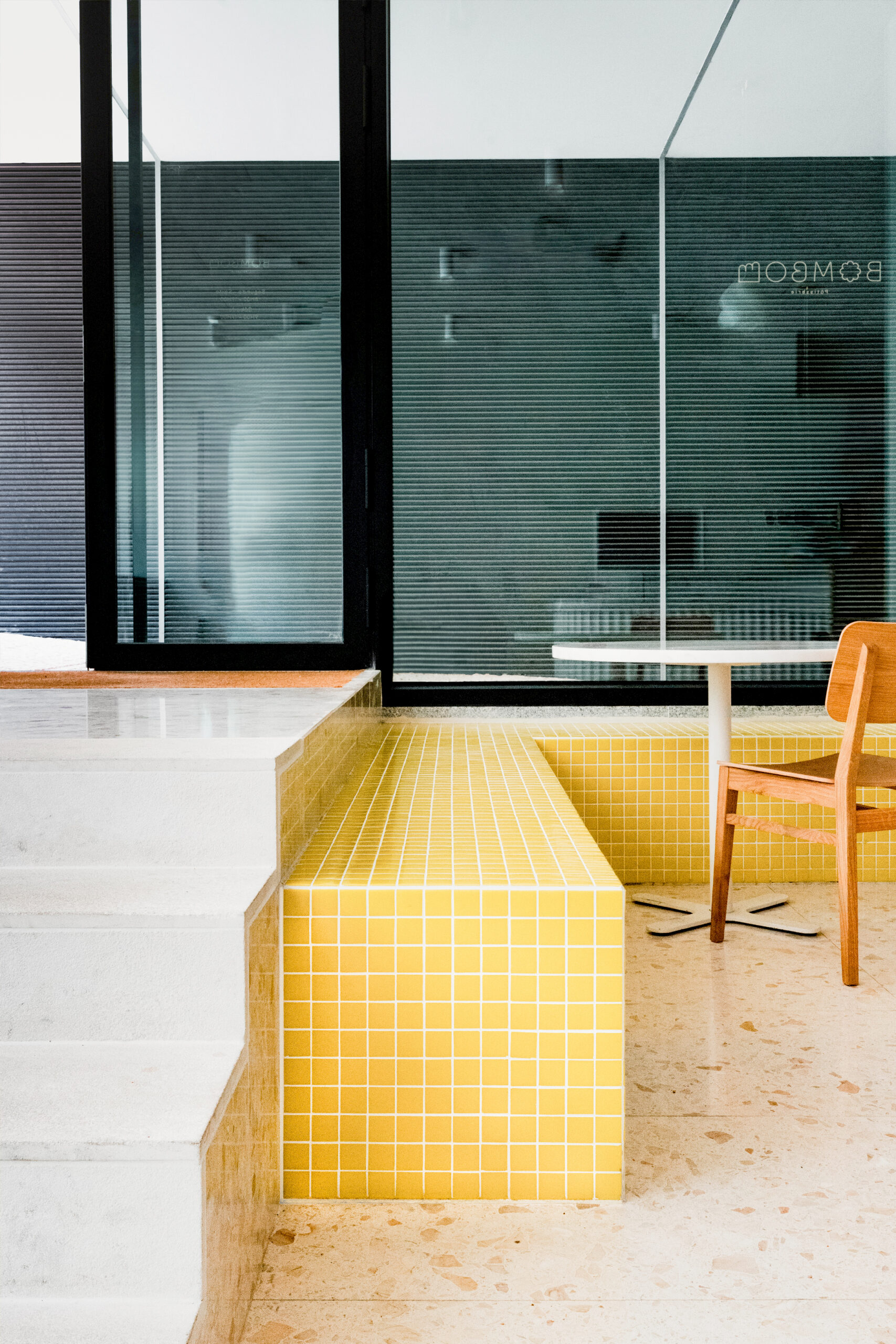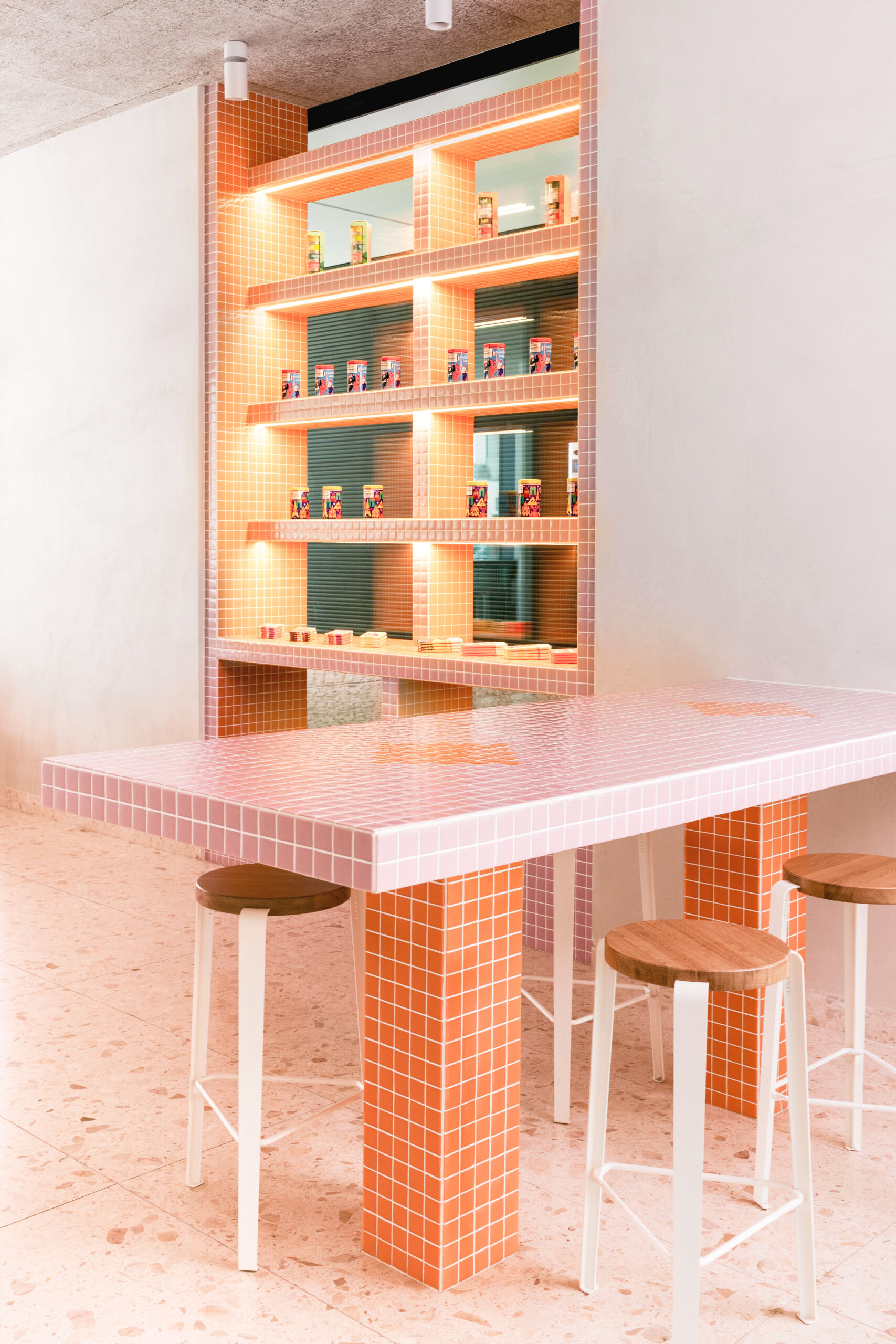 StudioBom’s signature geometric style is evident throughout, informed by its admiration for the radical Italian architectural collectives of the 1960s, such as Superstudio and the Memphis movement. Every piece of furniture was designed specifically for the project – from a wide, mid-height communal table and a pair of bold benches to a large display cabinet that doubles as a grocery unit and a high counter table.