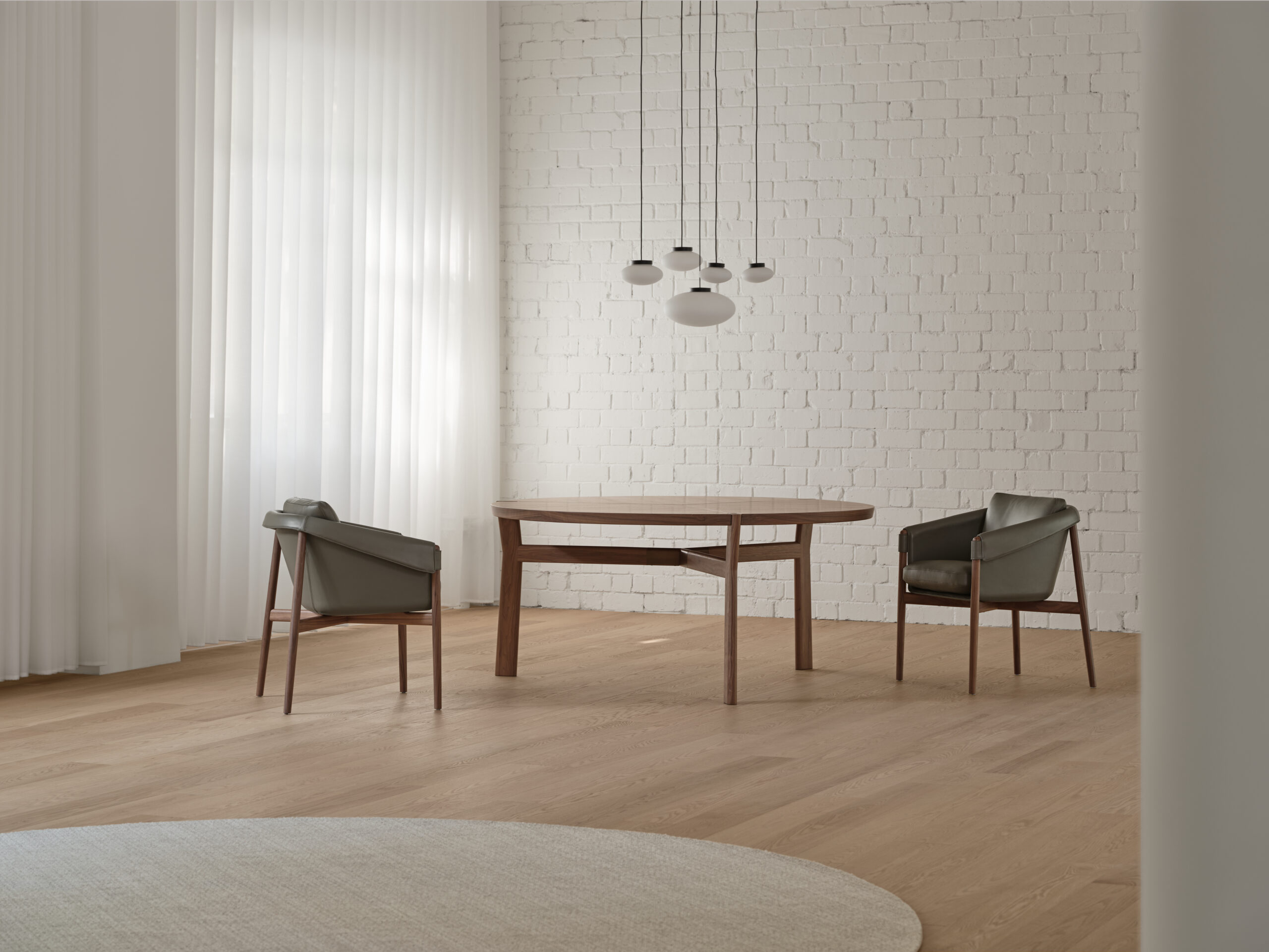 AM: The Marea collection is crafted primarily in solid ash wood. Ash is valued for its strength, stability, and refined grain, allowing the collection to maintain elegant proportions while meeting the durability requirements of hospitality and commercial environments. Its natural texture and versatility across finishes also support the adaptability of the collection across residential and contract settings.