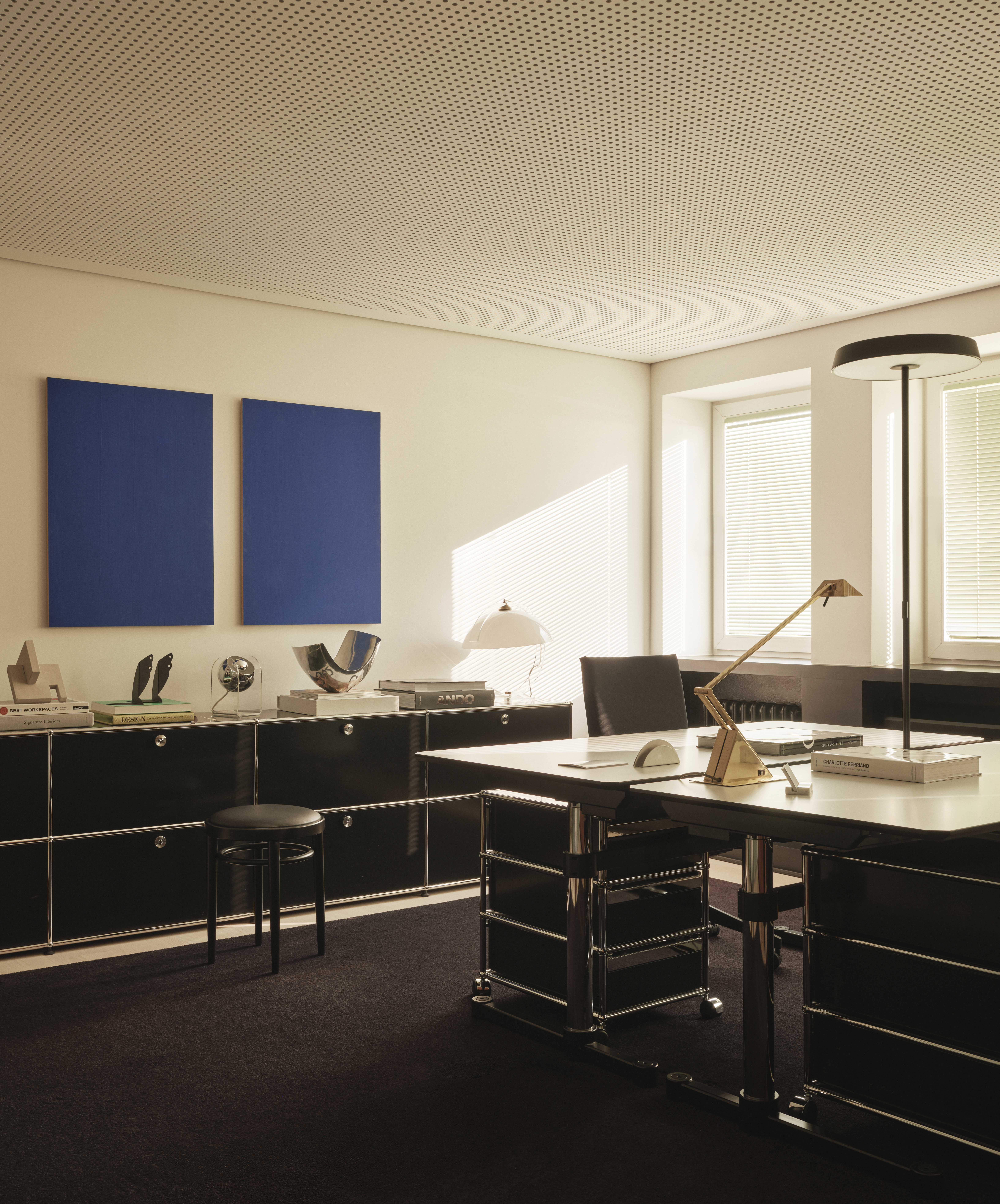 “Even the architecture of an office can be a little bit annoying and distracting,” says Stahl, who turned to his mentor and uncle Thomas van den Valentyn to design a calm and controlled set of spaces (from whom the concept also gets its name). Adapting the building floor by floor as the existing tenants gradually moved out, the architect has brought back some of its original appeal with a stripped-back concrete core, delicately filled in by glass partitions. Where many post-Covid-era office designs borrow soft details from hospitality and homes, Valentyns leans into icons from the office’s mid-century heyday. Furniture includes Thonet coat stands, Fritz Hansen chairs, Lampe Gras wall lights, USM Haller desks and Eileen Gray side tables. Contemporary tech has been integrated too, with sit-stand desks, acoustic materials and blinds that adjust at the touch of a button.